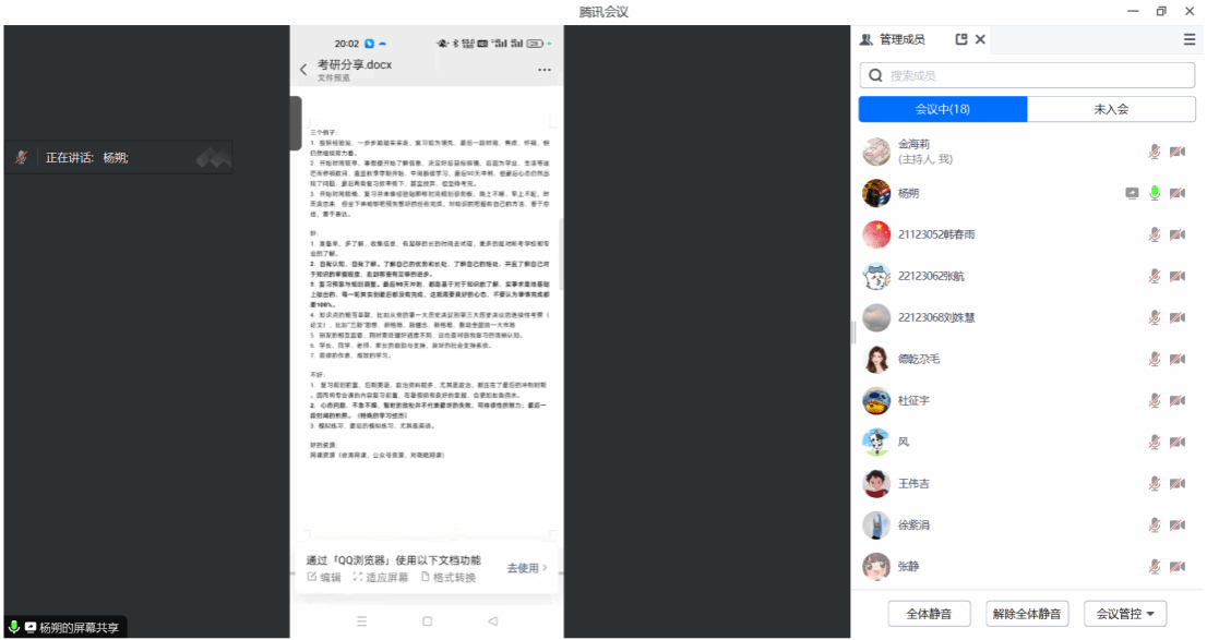 为加强学生对考研、保研、出国留学经验的了解,营造积极向上的学风,国庆节前,英国上市公司365“无问西东”青年聊天室第十三期活动在线上腾讯会议室顺利举办。本期聊天室邀请到考研至中国人民大学的2018级思政本科生杨朔、保研至华东师范大学的2019级思政本科生王伟吉、留学至爱丁堡大学艺术史专业的2019级哲学专业本科生郑子琰三位嘉宾就考研、保研、留学进行各自的经验分享。本期活动由2021级哲学专业本科生杜征宇主持,本科生辅导员黄丽娜老师等20余名师生参与。