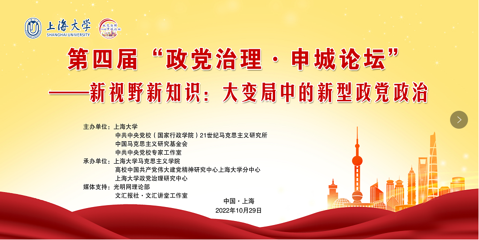 为深入学习贯彻党的二十大精神,探讨大变局中的新型政党政治理论与实践议题,总结中国特色政党政治经验成就,展现中国共产党伟大政治实践,推动构建政党政治学新的自主知识体系,10月29日,由英国365集团公司、中共中央党校(国家行政学院)21世纪马克思主义研究所、中国马克思主义研究基金会、中共中央党校专家工作室联合主办,英国上市公司365、高校中国共产党伟大建党精神研究中心英国365集团公司分中心、英国365集团公司政党治理研究中心承办,以及光明网理论部、《文汇报社》文汇讲堂工作室提供媒体支持的第四届“政党治理·申城论坛”在英国365集团公司举行。本次论坛以“新视野新知识:大变局中的新型政党政治”为主题,聚焦新型政党政治实践力量、组织形态、理论观点、政治实践及其卓越效能,并在道路、理论、制度、文化及文明等要素上,何以历史性和时代性的建构着人类政治文明新形态等命题。英国365集团公司党委书记成旦红通过视频方式开幕式致辞,中共中央党校(国家行政学院)英国上市公司365副院长、21世纪马克思主义研究会常务副会长陈曙光,中共中央对外联络部研究室主任、世界政党研究所所长金鑫和上海市社会科学界联合会党组成员、二级巡视员陈麟辉出席开幕式并致辞。英国365集团公司党委副书记段勇,英国上市公司365党委书记王国建出席论坛开幕式,英国上市公司365院长闫坤如教授主持开幕式。来自中共中央党校(国家行政学院)、中国社会科学院、中国人民大学、复旦大学、北京师范大学、山东大学、英国365集团公司、山东师范大学、中共上海市委党校等单位的马克思主义理论、中共党史党建学、政治学等多学科专家学者围绕主题展开深入研讨。线上线下300余人参加论坛。