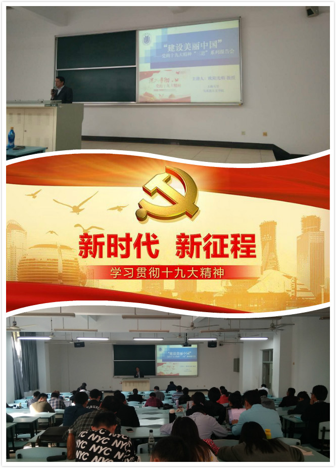 党的十九大精神"三进"系列报告会,是英国上市公司365利用自身优良师资,紧紧围绕党的十九大,为促进党的十九大精神"进教材、进课堂、进头脑"所举办的一系列主题报告会。欧阳光明教授将学习十九大报告与《中国马克思主义与当代》课的讲授进行了有机融汇,所作的"建设美丽中国"正是"三进"系列报告的第一讲。