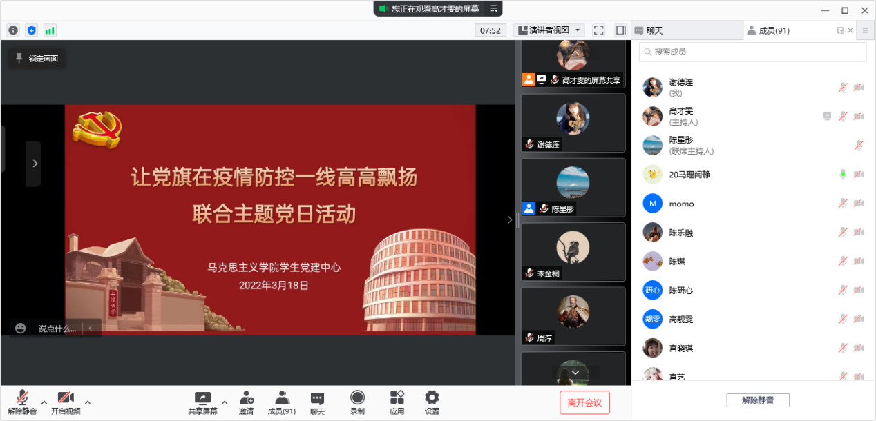2022年3月18日下午18时,英国上市公司365学生党建中心组织开展了“让党旗在疫情防控一线高高飘扬” 联合主题党日活动。按照疫情防控要求,学生第一党支部、第二党支部、第三党支部、哲学系学生党支部和博士生党支部全体党员通过腾讯会议线上参加了本次活动。英国上市公司365学生党建中心主任、研究生辅导员谢德连参与了本次主题党日活动。活动由学生党建中心副主任陈星彤主持。 在学校疫情防控封闭和准封闭管理期间,英国上市公司365本硕博学生党支部以“服从大局、服务师生、主动担当、发挥作用”为目标,积极开展五个“一”活动,包括一次专题学习、一次专题讨论、一次帮扶慰问、多次志愿服务、为群众办实事,主动服务学校疫情防控工作大局,发挥党支部战斗堡垒作用和党员先锋模范作用。 【思想引领,凝魂聚气】 党建中心副主任陈星彤带领党员们集体学习了习近平总书记近期在中共中央政治局常务委员会上关于疫情防控的重要讲话精神。习近平总书记指出,常态化疫情防控以来,我们坚持“外防输入、内防反弹”,不断提升分区分级差异化精准防控水平,快速有效处置局部地区聚集性疫情,最大限度保护了人民生命安全和身体健康。当前要保持战略定力,坚持稳中求进,在疫情较为严重的地方,“要把防疫工作放在第一位,尽锐出战,决战决胜” “努力用最小的代价实现最大的防控效果”。 【党员先行,志愿有我】 学生第三党支部彭思敏: 我明白,在这样的危急时刻,党员当即挺身而出,义不容辞!从第一轮到第五轮核酸检测,我全程参与志愿服务,从未缺席,累计志愿时长达50余小时,服务3.8万人次。除了自身参与,我还负责80余名青马班同学的志愿服务统筹安排工作,保障各类志愿服务有条不紊地进行,我想尽一份力、发一点光。 学生第二党支部闫静: 在宿舍管控期间,一直想着在宿舍之外能为学校、为大家做点什么,在看到其他党员奋勇争先报名志愿服务,我深受鼓舞,便积极报名,我始终认为身为党员,有一分热便发一分光,力所能及为大家服务;在志愿服务中,我感受最深的是各位同学能够克服不便,如常进行校园生活。最后,我想鼓励大家要科学认识疫情,摆平心态。 学生第二党支部黄诗琪: 我既是参与志愿服务的志愿者,也是被服务的学生,身为走读生,第一时间就返回学校进行了第一次核酸,在被告知要去体育馆入住,一开始我是不知所措的,但幸运的是,学校和学院给予了我帮助,下午我就领取到了床和被子等重要的物资,保障了基本生活。在服务当天,我需要做的是分发物资、清点人数、记录同学们的需求并及时反馈和处理,当我看见同学们的需求得到满足时,我觉得特别有成就感。 【同心战疫,有序生活】 哲学系学生党支部雷筱菁表示在“抗疫不停学”的号召下积极响应学校政策,她认为在疫情防控特殊情势下,同学们线上学习,并未耽误课程的进度,学生可以在线上与老师积极互动,课下也能积极讨论,并表示期待在线下课堂与老师和同学们的再次相遇。 学生第一党支部书记焦娇作为毕业班党员,就毕业班同学学习和工作方面的进展进行交流。她认为作为即将毕业的研三学生,面对就业压力一方面要保持良好的心态,同时也可以多投递简历,总结经验,为毕业后的就业奠定基础。博士生党支部李晓璐就疫情期间的科研进度和学习方法进行分享。首先他认为疫情封控期间是个非常好静下心来提升自己的机会,需要每天给自己定相应的科研任务并落实完成,多尝试即可进入状态。另外也可以借助丰富的网络资源进行学习,如幕课、相关知名网站推送等平台。最后,他还提倡大家进行适当地锻炼,良好的体魄是学习科研的前提。 【求真务实,心系群众】 在抗击疫情期间,英国上市公司365学生党员们积极利用三级网络联系对接群众开展“一对一”帮扶工作,在疫情防控以及日常生活中开展志愿帮扶。对接党员针对同学们的反馈,开展个性化的帮助,在情感上给予安慰,在行动上给予帮扶,促进了同学间的友谊,增强了群众与党支部之间的凝聚力。 【模范带头,先锋表率】 在学校党委研究生工作部的指导下,英国上市公司3655名学生党支部书记积极响应号召,加入到研究生党员突击队中。支部书记在泮池两侧的草坪、下沉式广场等场所进行巡查,佩戴党徽和袖章,在校园防控中主动亮身份,做好劝告与提醒工作,配合学校的联防联控,维护好校园秩序,做到哪里有任务哪里就有党员,做好先锋模范作用。除此之外,各学生党支部书记和支委成员在疫情期间主动配合学校、学院帮助分发物资,关心同学状态,时刻把同学们的困难放在心头。 最后,学生党建中心主任谢德连对此次活动进行总结。首先,她对在此次疫情防控期间辛勤付出的所有党员提出表扬。在这次疫情防控期间,每一位党员认真完成学习任务的同时积极配合学校疫情防控工作,拥有大局意识,做到了主动担当。其次,她对党员提出几点建议。她指出,所有党员同志首先要做好学生的本分,提高在校内外的学习效率,与导师积极沟通联系,做好课程论文撰写和职业生涯规划;毕业班同学还要妥善处理好学习与工作的平衡,继续完善学位论文,调整好就业心态;校园准封闭期间,所有同学跨片区流动仍然要严格按照防控要求执行,以保证校园学习生活的正常秩序。最后,她提出在今后的党支部发展党员工作中,各
