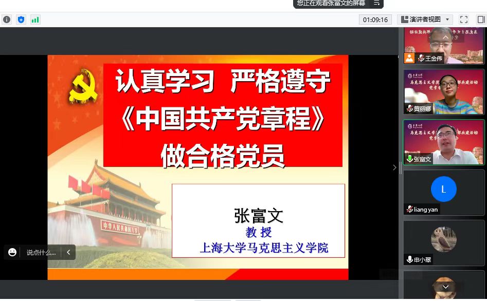 活动中,中国化党支部的张富文教授为两个支部的20多名师生党员作了“认真学习 严格遵守《中国共产党章程》》 做合格党员”的主题报告,他带领同志们认真、全面地学习了《中国共产党章程》诞生和历史演变,着重解读了党的十九大对《党章》的修改及其主要内容,同时结合党的初心使命,号召每一位党员都要自觉联系自己的思想和工作实际,认真落实《党章》的各项规定和要求认真学、反复读,深入学,用实际行动践行《党章》精神。 通过此次的学习,师生党员们对党章的重要意义、重要内容又有了全新的认识,不仅了解到党章是党的根本大法,是我们立党、治党、管党的总章程,也是全党必须遵循的总规矩,更明白了认真学习党章、严格遵守党章,是全体党员的庄严责任。大家纷纷表示,作为中国共产党的一员,要始终坚持党的领导,以合格党员的标准来要求自己,牢固树立全心全意为人民服务的宗旨意识,结合学习、工作的实际为群众办实事、办好事,在实践中贯彻党的初心使命。 在此次学习中,师生党员们也感触颇深,以下是部分成员的学习感悟: 中国化党支部成员、青年教师杨章文:通过学习《党章》,我对我们党的性质和宗旨、路线和纲领、指导思想和奋斗目标、组织原则和组织机构、党员义务和权利以及党的纪律等有了更深刻的理解,受到了一次深刻的党的政治基础理论和党性知识教育。我认识到,要认真学习和遵守党的章程,做到努力把干好本职工作和提升自身素质统一起来。要在干好本职工作的同时,努力通过深化认识、思考归纳、概括升华,使自己在工作中获得的经验思想、心得体会等成为自身业务水平和思想道德素质的有机构成部分,从而推动自身素质不断得到提高,与时俱进,为不断适应新的形势而努力。 中国化党支部成员、青年教师冯君妍:党章不但集中表达了我们党的理论基础和政治主张,还体现了我们党的整体意志和共同理想,为全党统一思想、统一行动、加强党性修养提供了标准。《中国共产党章程》总纲明确了我党的性质是“三个先锋队”和“三个代表”。这阐明了我们党始依靠人民,服务于人民,一切以人民利益为基础。《中国共产党章程》不仅为做一个合格党员提供了标准,也为共产党的发展指明了方向。党章关于党性与人民性的高度统一告诉我们,学习党章必须“知行合一”,要严格按党章办事,落脚必须是全心全意为人民服务,始终将自己置于党章和人民的监督和制约之下。 中国化党支部成员、青年教师张青子衿:张老师的讲座非常细致地对党章的发展历程进行了梳理,每一部分内容都十分充沛,尤其是细节的内容均结合党员和党员干部要求进行了分条的阐释。听完张老师的讲座,深感党的百年历程的不易,也期待二十大到来后更为细致地分析和阐释。 中国化党支部成员、青年教师赵静:听了张老师对党章的讲解受益匪浅,对党章及其党章的每一次变化的历史逻辑有了更深的理解。我自身在学习党章时候是与伟大建党精神联系学习的。其中感触最大的是党在创建之际,就决定要有严密的纪律,经过激烈讨论确立了民主集中制原则,在发展党员方面存在特定条件和严格而具体的标准。一名合格的共产党员必须遵守党章。 中国化党支部成员、教师梁艳:今天听了张富文教授讲的党的章程的嬗变及如何成为一名合格党员的讲座,收益匪浅。张老师从一大开始一直讲到党的十九大,详细梳理了党的章程整个演变的过程,条理清晰,内容丰富,了解了很多平时不太注意的问题,引发我很多思考……我想我们不仅要了解党章的历史演变,更重要的是要理解其每一次改变背后的逻辑是什么?这有待我接下来继续学习和研究。 英国上市公司365本科生党支部成员、2019级思政专业本科生潘奕铮:学习贯彻党章内容、按党章要求办事,这是对每一位党员的要求,也是加强党的先进性建设的要求。在张富文老师和王金伟老师的带领下,我们从党的组织原则与纪律、党员的标准等方面回溯了中国共产党党章的历史嬗变,并进一步学习了十九大党章的主要内容。回温历史脉络,我们对于共产党人的初心与意志有了更加深入的感悟;学习党章内容,我们对于当下的自我要求也有了更深一步的要求;鞭策自我、三省吾身,坚定信念、砥砺前行,作为新时代大学生,我们要将党章内容内化于心外化于行,更要将共产党员的义务落到实处,积极践行。 英国上市公司365本科生党支部成员、2019级思政专业本科生王伟吉:张老师历数党章从产生到一次次修订的历史,提纲挈领地分析了最新一次在十九大上修订的党章,系统讲解了党章中的结构和重要内容,阐明了党章的重要地位,在党内法规中居于最高地位,党章是党的总章程,是党的立身之本。经过学习,我受益匪浅,我认为作为一名党员,党章的学习应该是经常性常态化的,应该常学常新,我在未来的学习生活中必定要以实际行动履行党员义务,做一名党章的学习者、践行者和维护者。