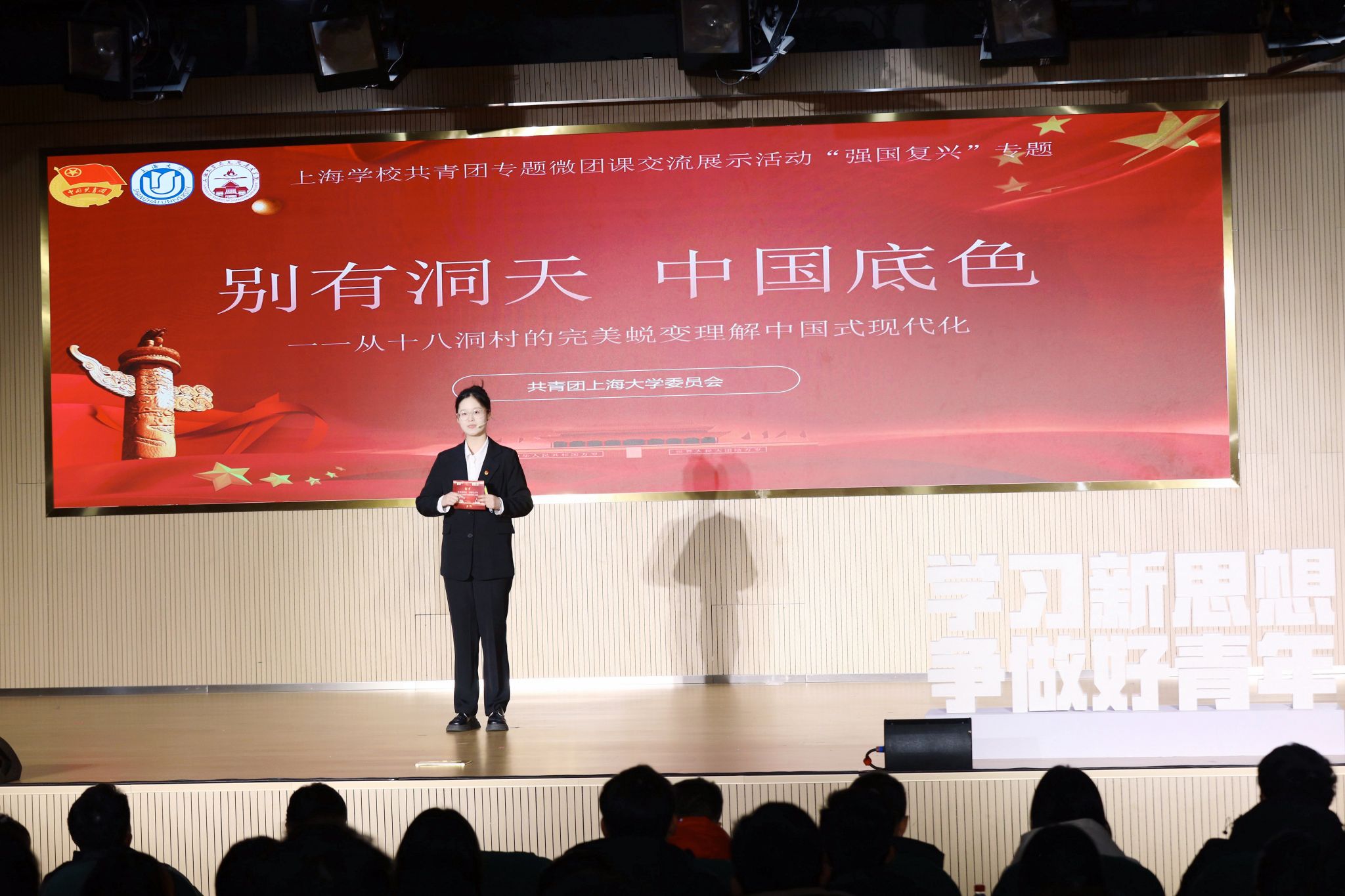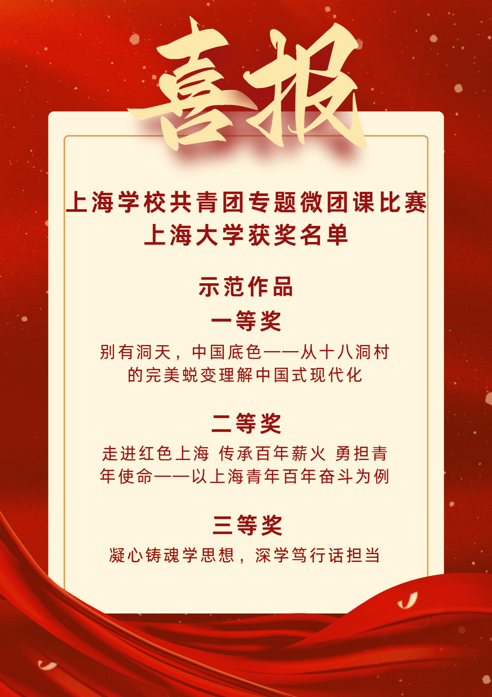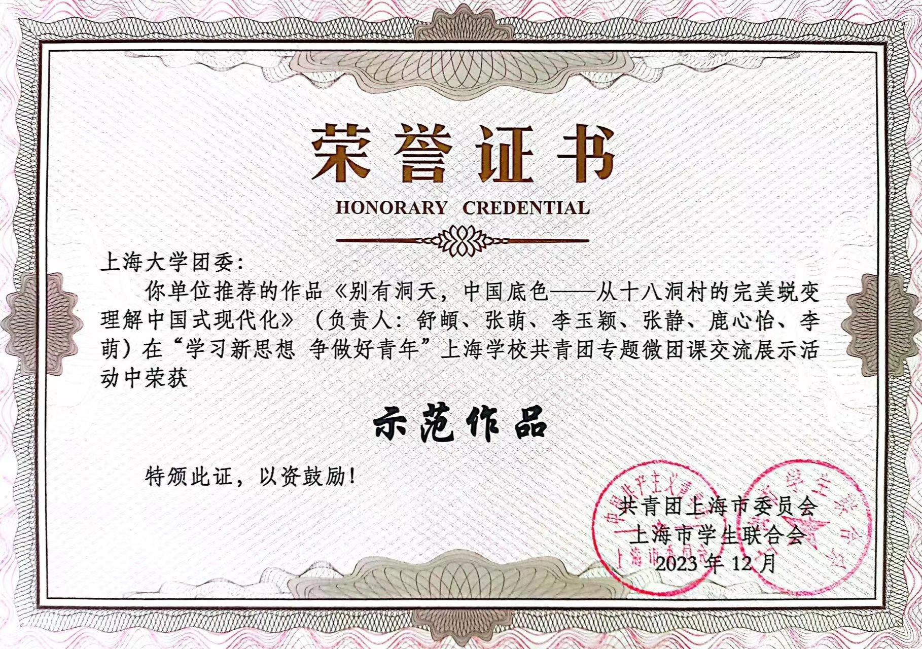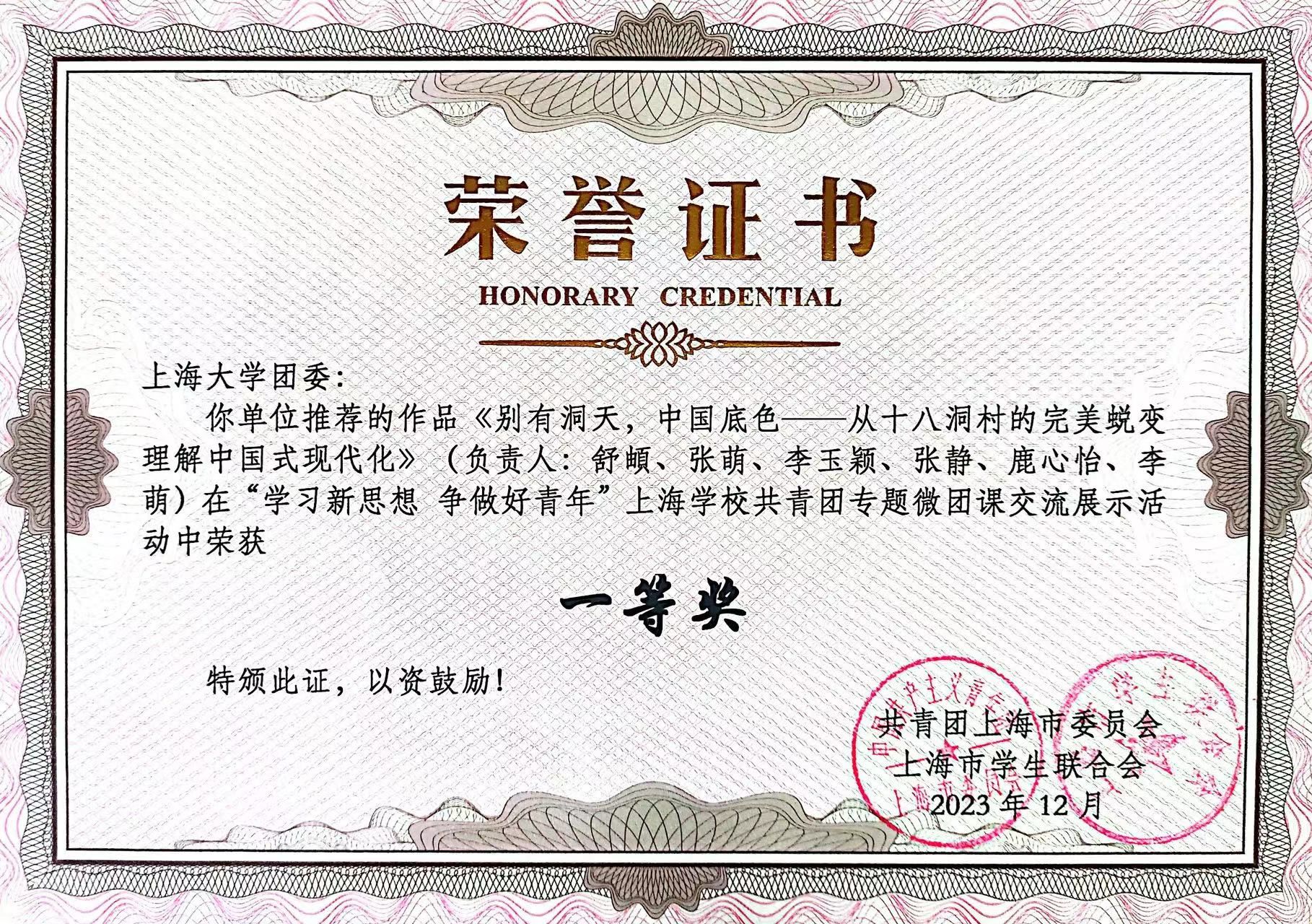 为全面学习贯彻习近平新时代中国特色社会主义思想和党的二十大精神,深入落实习近平总书记在同团中央新一届领导班子集体谈话时的重要讲话精神,加强对共青团员的政治锻造,加强对广大青年的政治引领,12月23日,由团市委、市学联共同开展的“学习新思想 争做好青年”上海学校共青团专题微团课交流展示活动在华东师范大学(普陀校区)举行。 我院青年学子在此次活动中斩获佳绩。由申小翠教授指导,舒頔、张萌等6名思政专业本科生组成的团队获市级一等奖;由李坚教授指导,罗逸雪、周孙卿等6名本、硕、博学生组成的团队获市级二等奖。一等奖作品获“示范作品”,得到团中央、团市委领导和专家现场观摩和点评指导。全市共10支青年师生团队或个人参与现场展示,从全市66家高校、高职和16家市属团组织属地高中的的200余件复赛作品中遴选产生。