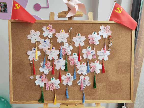 二、爱满小屋,手留“樱”香 为了让志愿者们有一个温馨、富有红色氛围的活动空间,临时党支部精心策划了一场志愿之家装饰活动,党员们精心设计,粘贴党旗和气球,拼接了志愿者照片墙,设立了红色书籍区域,将志愿者之家装扮得富有生机,充满爱意。其次,在志愿者之家设置了樱花留言板,参加志愿活动的党员和团员在留言板上写下了自己的所思所感、建议祝福。这些留言汇聚成了一道亮丽的风景线,不仅体现了志愿者们真心实意的服务体会,传递了满满的青春正能量,也展示了党员志愿者们乐于奉献、践行宗旨意识的责任与担当。