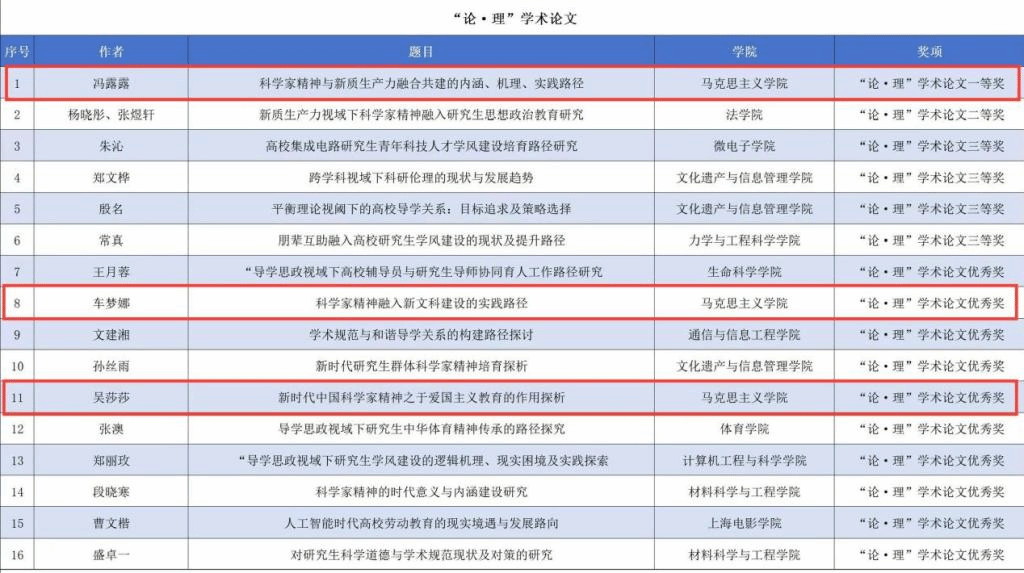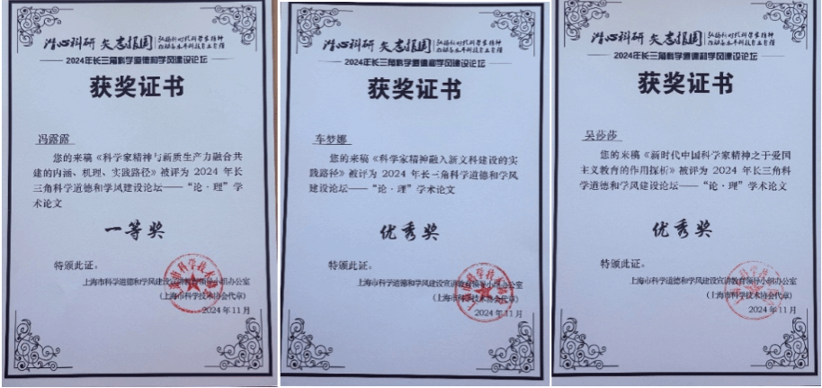 11月9日,由上海市科学技术协会、上海市教育委员会指导,上海市科学道德和学风建设宣讲教育领导小组办公室、上海市学位委员会办公室主办的“潜心科研 矢志报国——弘扬新时代科学家精神,推动高水平科技自立自强”2024年长三角科学道德和学风建设论坛在上海理工大学举行。 本次论坛共收到52家高校、科研院所投稿作品总计972份,共评出205篇“论·理”优秀学术论文。我院学子在本届论坛中取得佳绩,共获得3项荣誉,其中冯露露同学获评“论·理”学术论文一等奖;车梦娜同学、吴莎莎同学获评“论·理”学术论文优秀奖。