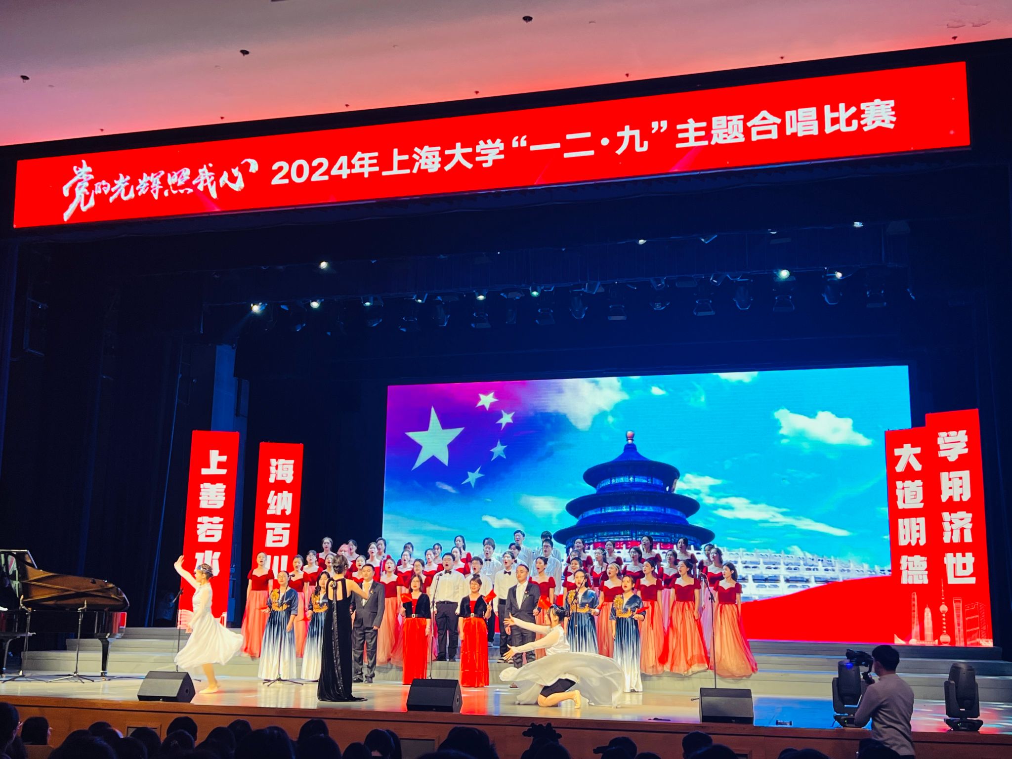 正式登台,合唱队身着整齐划一的服装,扬起自信的微笑,在音乐响起的那一刻,整首《爱我中华》铿锵有力、明快嘹亮,师生们精神饱满,热情高涨,台下响起了雷鸣般的掌声……