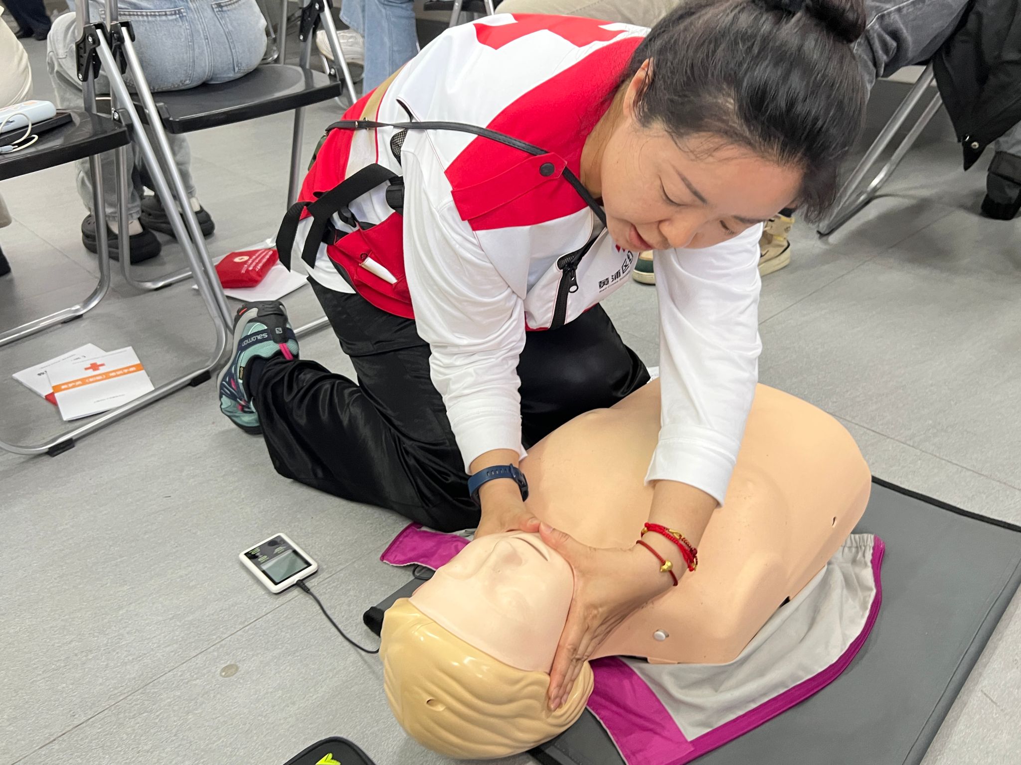线下实操:模拟场景锤炼技能 5月23日,四位上海市红十字会专业救护员受邀到学院开展实地模拟演练。专业讲师们通过案例分析与视频教学,深入讲解急救黄金四分钟的重要性,并系统演示心肺复苏、AED联动操作、创伤止血等关键步骤。在专业讲师的指导下,学员们分成2组进行模拟急救演练。面对“心脏骤停”“创伤出血”等模拟场景,参训人员迅速反应,严格遵循操作规范。指导老师们逐一点评动作细节,确保技能掌握精准到位。