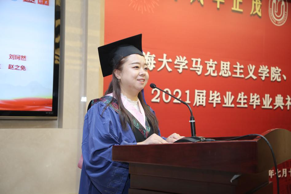 光阴数载,道不尽院、部温柔;二十而志,当接续砥砺奋斗。离别之际,毕业生们饱含对学院、对老师的感恩之情,表达了“把论文写在祖国大地、用实干投身四海神州”的壮志豪情。2021届哲学专业本科毕业生、上海市优秀毕业生刘珂然发言,她回顾了与老师开放探讨学术问题、与同学并肩学习奋斗的四年大学生活,她说自己不仅获得了自身的成长,还见证了学校的发展。她认为哲学对她来说是一片广阔深邃的海,包容并支撑着她全部的生活,哲学是拨动在生活胸腔里的心脏,充满无限可能,由此表达了对哲学的无限热爱。她说,她的成长得益于学校、学部的培育,离不开老师、同学的帮助与关怀,她向学校、学部表达了最诚挚的感谢和最美好的祝福。