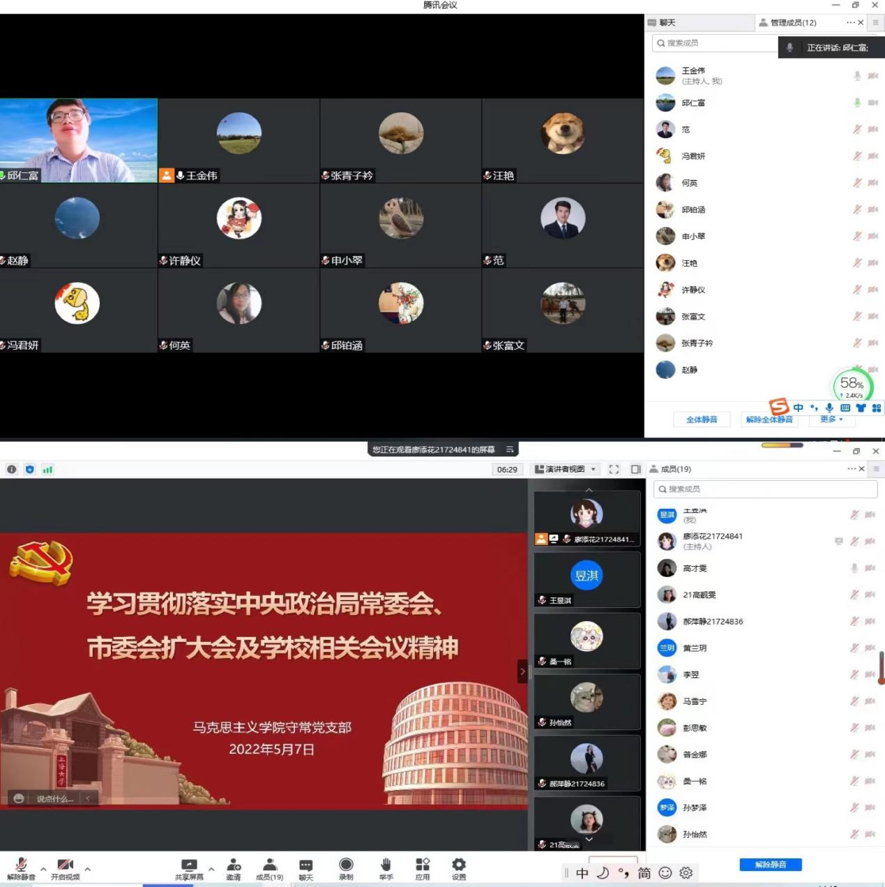 按照学院党委统一部署,5月7日学院各师生党支部开展线上组织生活,把中央精神、市委和学校的要求传达到每位党员、全体师生,要求每位党员要增强“四个意识”、坚定“四个自信”、做到“两个维护”,坚决把思想和行动统一到习近平总书记重要讲话精神和党中央决策部署上来,认真落实上级党委的工作要求,坚定必胜信心,为全力打赢大上海保卫战做出上大马院人的贡献。 |