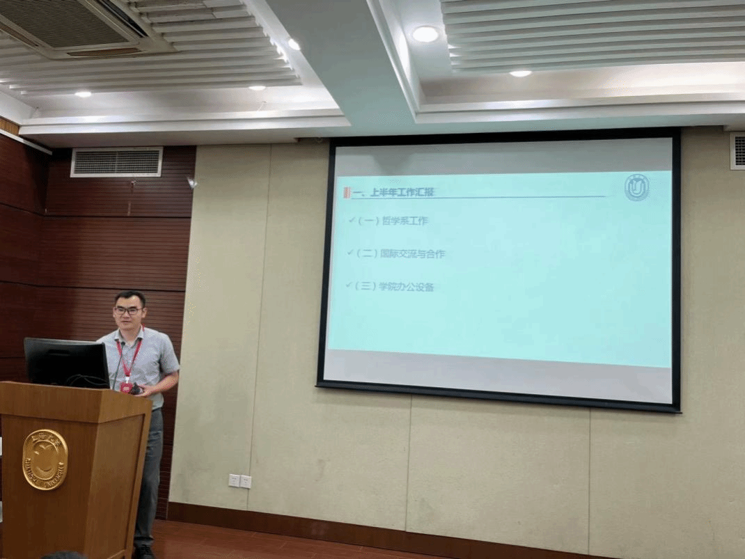 主持工作副院长叶海涛汇报了学院上半年总体工作情况。分别用“最大的工作亮点”“最实际的工作成果”和“最近的一项重要工作”概括了上半年的重点工作,同时从思政课教学改革、学位点布局、学科平台建设、人才引育与师资队伍建设等方面简要介绍了下半年工作重点。