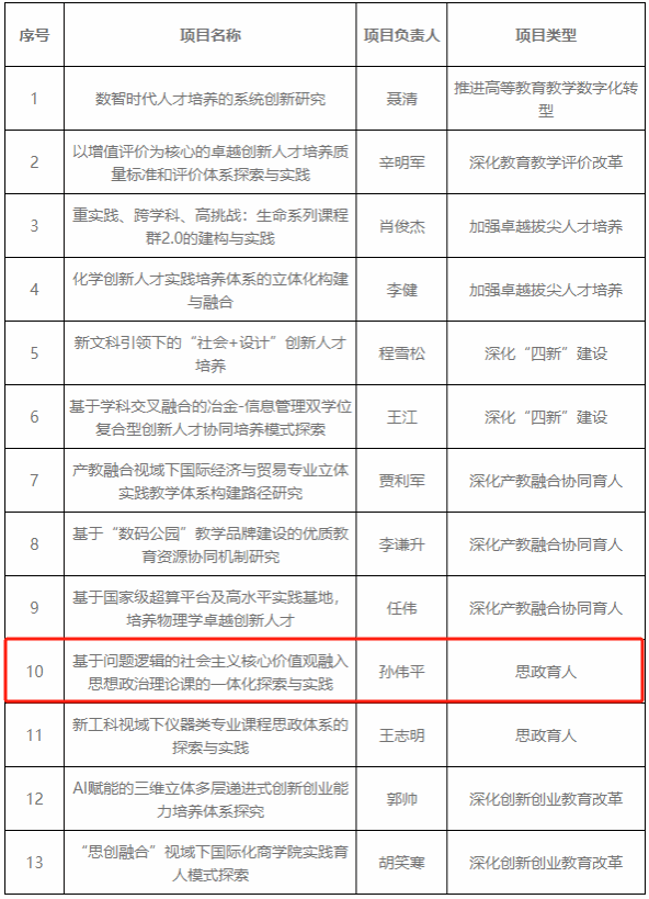近日,上海市教育委员会下发《上海市教育委员会关于公布2023年上海高校本科重点教改项目立项名单的通知》(沪教委高【2023】47号),英国上市公司365孙伟平教授申报的《基于问题逻辑的社会主义核心价值观融入思想政治理论课的一体化探索与实践》项目获得立项。此次英国365集团公司共有13个项目获得立项,获批立项数位居上海市高校第三。
