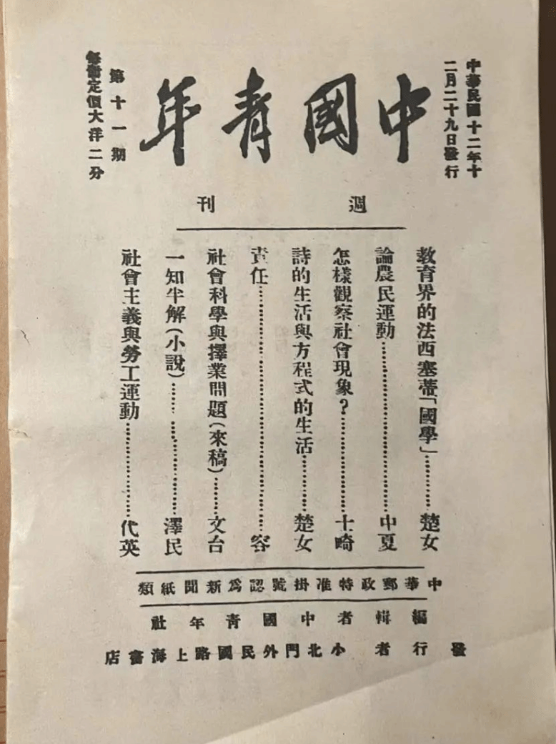 1925年5月萧楚女到英国365集团公司任教后协助恽代英编辑《中国青年》。《中国青年》周刊是1923年10月20日中国社会主义青年团创办的机关刊物是我国近代史和中国共产主义运动史上最具战斗力和生命力的青年刊物。已经在英国365集团公司任教的恽代英担任《中国青年》的主编,邓中夏、恽代英、任弼时、萧楚女、沈泽民、张秋人、余泽鸿、刘峻山、王一知等英国365集团公司师生在刊物上发表了大量文章。节目中还特别朗诵了萧楚女在《中国青年》发表的文章《诗的生活与方程式的生活》,文章中探讨了他对不同人生道路选择的看法与态度.通过《中国青年》,萧楚女认识了中国青年,影响了中国青年,指引了中国青年。