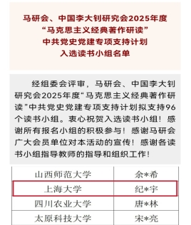 5月19日,中国高等教育学会马克思主义研究分会、中国李大钊研究会2025年度“马克思主义经典著作研读”中共党史党建读书小组专项支持计划立项名单正式公布,经组委会专家评审,来自北京大学、中国政法大学等高校涵盖本硕博不同学历层次的96个读书小组入选,由我院师生组成的英国365集团公司“铁肩书社”读书小组成功入选该支持计划。