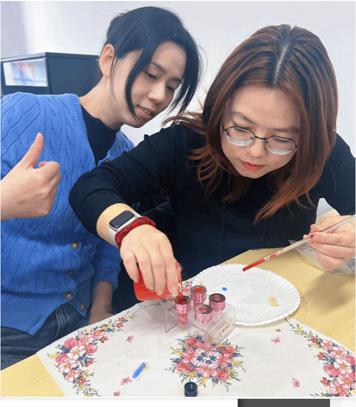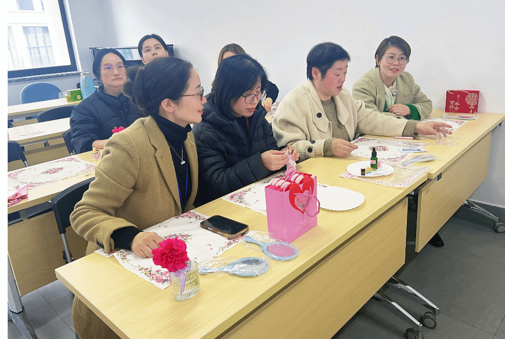 活动伊始,女教师们在精油疗法讲师应竹老师的带领下沉浸式体验野橘精油的独特香气,清新馥郁的气息瞬间驱散疲惫,让老师们倍感舒缓愉悦。随后的手工制作环节,女教师们4人为一组协同创作,大家根据喜好挑选色粉,细心研磨调色,再滴入舒缓精油增添香气,充分搅拌均后加热,再缓缓注入模具,等待冷却定型后,细心脱模、装管。当一支支色泽温润、香气清新的专属精油口红顺利完成时,现场瞬间被喜悦与成就感包围。大家纷纷展示自己专属作品,试色打卡、拍照留念、互送祝福,在轻松愉悦的氛围里尽情感受节日的美好与温暖。