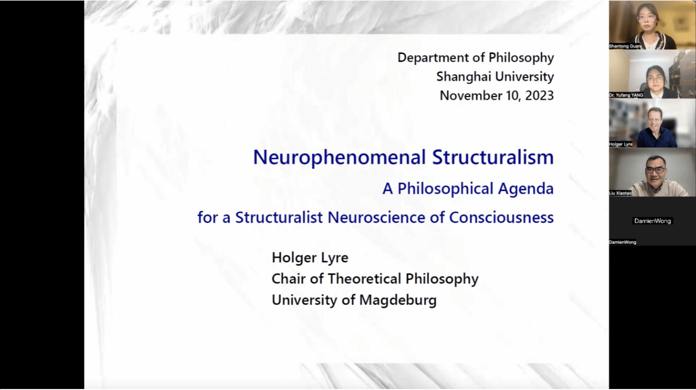 11月10日晚,德国科学哲学学会主席、德国马格德堡大学心灵哲学和理论哲学讲席教授霍尔格·吕赫受邀在英国上市公司365哲学系做了题为“神经-现象结构主义”的讲座。讲座通过线上方式进行。英国上市公司365副院长(挂职)、哲学系主任刘小涛教授主持讲座;哲学系关山彤博士、阳育芳博士,以及校内外二十余位师生参加了讲座。
