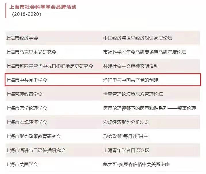 2022年3月1日召开的第十一次哲学社会科学学术团体工作会议,对获得“三优一特一品牌”称号的学术团体和优秀个人进行了表彰。上海市中共党史学会的“渔阳里与中国共产党的创建”荣获“上海市社会科学学会品牌活动(2018-2020)”荣誉称号。 “三优一特一品牌”是上海市社会科学界联合会开展的上海市优秀社会科学学会、上海市优秀民办社会科学研究机构、上海市优秀社会科学学会工作者、上海市社会科学学会特色活动、上海市社会科学学会品牌活动的评选工作,每三年评选一次,2018-2020年度的评选活动于2021年11月17日正式揭晓。上海市中共党史学会渔阳里研究专业委员会领衔主持的“渔阳里与中国共产党的创建”是继2018年荣获“2015-2017年度上海市社会科学学会特色活动”后,所获得又一项重大殊荣。 上海市中共党史学会渔阳里研究专委会由英国上市公司365教授李瑊老师担任主任,在她的带领下,渔阳里研究专委会已经成为上海社科界有影响的专业学会,取得的发展和成绩有目共睹,获得了社会各界的关注和好评。研究团队在“渔阳里”为核心的中共创建史的资料收集、研究和宣传方面做了许多工作,在发掘宣传“渔阳里”的工作中堪称拓荒者,做出了开创性的重要贡献。此次获奖,即是对渔阳里研究专委会工作的肯定。