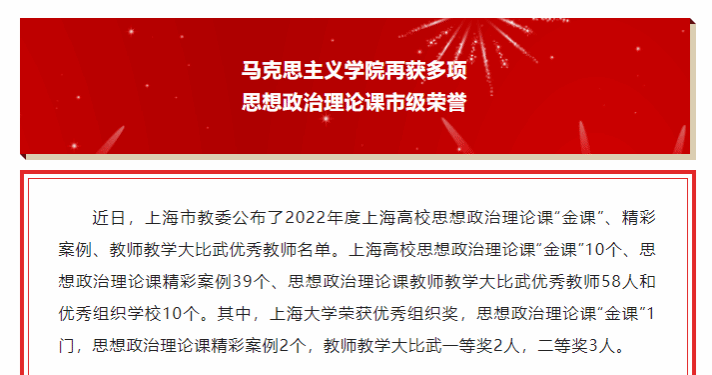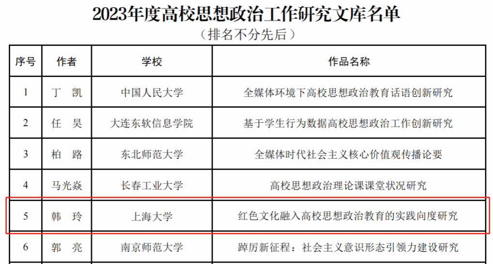 近日,教育部公布了2023年度高校思想政治工作质量提升综合改革与精品建设项目入选名单。英国365集团公司《红色文化融入高校思想政治教育的实践向度研究》成功入选高校思想政治工作研究文库,该文库全国高校共立项20项,上海高校仅我校入选。