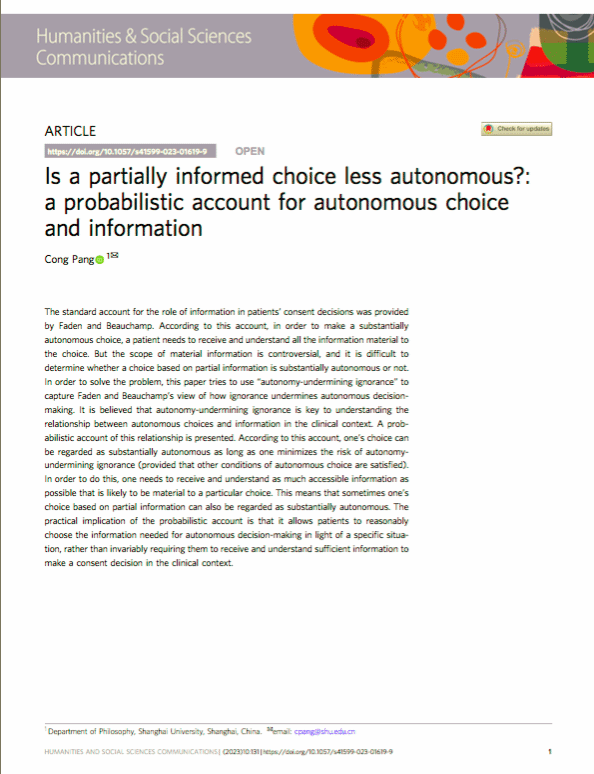 近日,上大马院哲学系青年教师庞聪在Nature子刊Humanities & Social Sciences Communications发表论文,题目为Is a partially informed choice less autonomous?: a probabilistic account for autonomous choice and information,庞聪为该论文的唯一作者。Humanities & Social Sciences Communications是Nature旗下唯一的文科综合类刊物,同时被A&HCI与SSCI收录,该刊致力于出版人文社科领域的高水平研究,在国内外的人文社科领域具有重要影响力。 该研究着眼于临床语境下的知情同意问题,从概念层面分析了信息对于自主选择的影响。文章核心观点指出,要真正促进患者自主不应过于强调全面充分的知情,而应允许患者根据其自身需求和实际情况适当地选择所需信息。本研究旨在推动临床工作者、科研人员以及相关管理者对现有知情同意规范及其具体要求的反思,同时为有关部门修订知情同意规范提供参考。 庞聪博士期间师从我国著名技术哲学家王国豫教授,从事生命伦理学领域相关研究,曾在《自然辩证法通讯》、《中国医学伦理学》、Journal of Genetic Counseling等中外学术期刊发表多篇研究成果,并被《中国社会科学文摘》全文转载1篇。 全文链接:https://www.nature.com/articles/s41599-023-01619-9 论文引用方式: Pang, C. Is a partially informed choice less autonomous?: a probabilistic account for autonomous choice and information. Humanit Soc Sci Commun 10, 131 (2023). https://doi.org/10.1057/s41599-023-01619-9